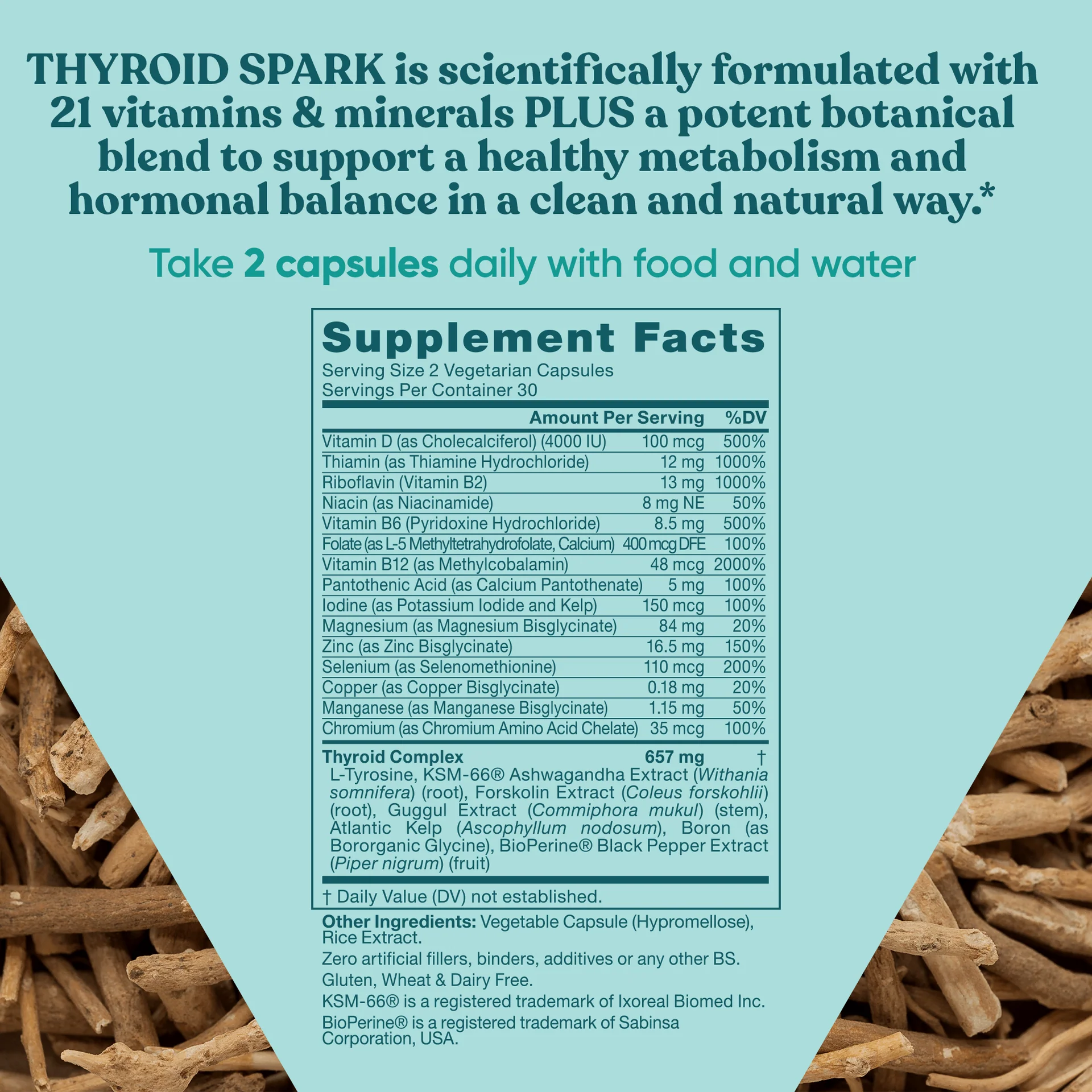 L-Tyrosine, Organic KSM-66® Ashwagandha Extract (Withania somnifera) (root), Forskolin Extract (Coleus forskohlii) (root), Guggul Extract (Commiphora mukul) (stem), BioPerine® Nutrient Enhancer (Piper nigrum)