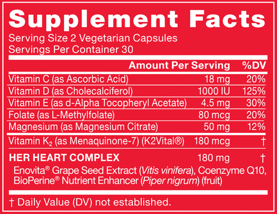 Folato: HEART DEFEND-HER es una buena fuente de folato, una vitamina B esencial para el correcto metabolismo de la homocisteína (es decir, su descomposición y reciclaje). De hecho, el folato es el principal determinante dietético de la homocisteína, cuyo exceso (por ejemplo, una baja ingesta de folato) se ha relacionado con problemas cardíacos.